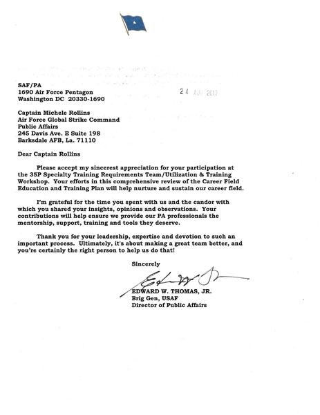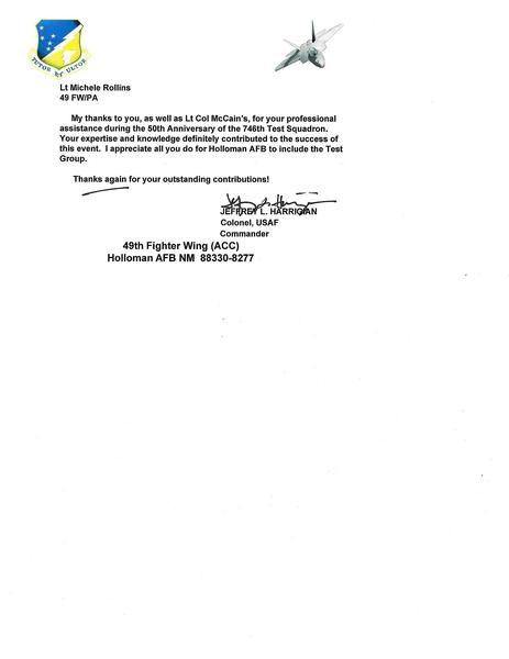 Thank you letters for 50th Anniversary of the 746th Test Squadron